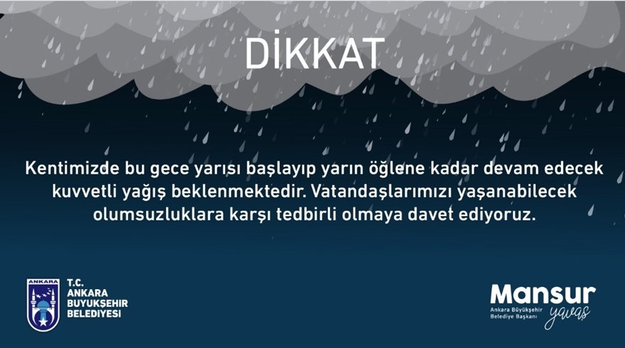 Ankara Büyükşehir Belediye Başkanı Mansur Yavaş da Ankaralı vatandaşlara sağanak yağış uyarısında bulundu. Muhtemel olumsuzluklara karşı ekiplerin hazırlıklı olduğunu belirten Yavaş, “Hepinizi tedbirli olmaya davet ediyorum. Başkent 153 hattımızdan daima bizlere ulaşabilirsiniz” dedi.