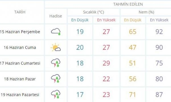 15 Haziran 2017 Perşembe 12:39Marmara'nın kuzey ve doğusu, Batı Karadeniz, Orta Karadeniz kıyıları, Doğu Karadeniz, Doğu Anadolu'nun kuzeyi ile Çanakkale, Balıkesir, Kütahya, Manisa, Uşak, Amasya çevreleri ile Tokat’ın kuzey kesimleri, Çanakkale’nin doğu kesimleri ve Akdeniz’in iç kesimlerinin yükseklerinin kısa süreli ve yerel olmak üzere sağanak ve yer yer gök gürültülü sağanak yağışlı geçeceği tahmin ediliyor. Hava sıcaklıklarının ise ülkemizin kuzey ve doğu kesimlerinde 1 ila 4 derece azalacağı, Akdeniz ile İç Anadolu’da 2 ila 5 derece artacağı tahmin ediliyor.