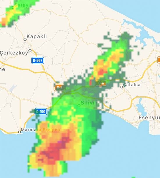 29 Eylül 2020 Salı 14:16İstanbul’un Avrupa yakasında süper hücre! : Meteoroloji Genel Müdürlüğü tarafından yayınlanan son dakika uyarısına göre İstanbul’un Avrupa yakasında şiddetli yağış başladı. Saat 11.00’de başlayan şiddetli yağışın akşam saatlerine kadar etkili olacağı bildirildi. Marmara üzerinde oluşan süper hücre Silivri, Büyükçekmece, Çatalca, Arnavutköy çevrelerinde yer yer kuvvetli yağışlar bırakacak. Bu ilçelerde ani sel, su baskını, yerel dolu yağışı, yağış anında kuvvetli rüzgar ve hortum oluşma riski bulunuyor.