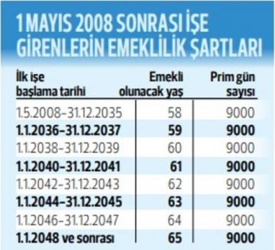 25 Haziran 2020 Perşembe 21:461.5.2008 tarihi de dahil bu tarihten sonra ilk kez işe başlayan kadın memurların emeklilik şartları değişiyor. Burada sigorta başlangıç tarihi değil, 9000 prim ödeme gün sayısını doldurdukları tarihe göre emeklilik durumu belli oluyor. Örneğin, 1 Mayıs 2008 ila 31 Aralık 2035 tarihi arasında işe başlayanlar 9000 bin günü doldurduklarında 58 yaşında emekli olabiliyorlar. Tabloda kadın memurların 9000 prim gün sayısına göre emekli olacakları yaşlar detaylı yer alıyor. YAŞ HADDİNDEN NASIL EMEKLİ OLACAKSINIZ? 8 Eylül 1999 tarihinde 50 ve daha yukarı yaşlarda olan kadın memurlar 61 yaşını tamamlamaları halinde ya da 65 yaşını tamamladıklarında; fiili hizmet sürelerinin 10 yılını doldurmuş olmaları halinde kendi istekleri ile emekli olabilirler.