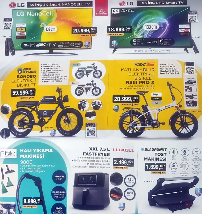 Ayrıca, elektrikli ev aletleri grubunda FAKİR markasıyla 2 yıl garantili Halı Yıkama Makinesi 9,999 TL, Fakir Noble Saç Kurutma Makinesi 899 TL, LuXEL markasıyla XXL 7.5 Litre Fastfryer 2,499 TL ve HEİFER markasıyla Mini Blender Set 999 TL gibi ürünler de cazip fiyatlarla sunulacak. Haberimizin devamını okumak için Lütfen sonraki sayfaya devam ediniz.
