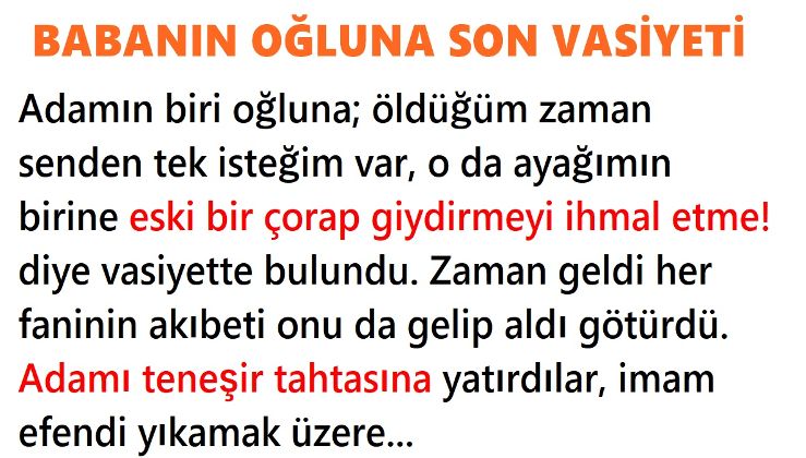 Adamın biri oğluna; ö-ldüğüm zaman senden tek isteğim var, o da ayağımın birine eski bir çorap giydirmeyi ihmal etme! diye vasiyette bulundu. Zaman geldi her faninin akıbeti onu da gelip aldı götürdü.