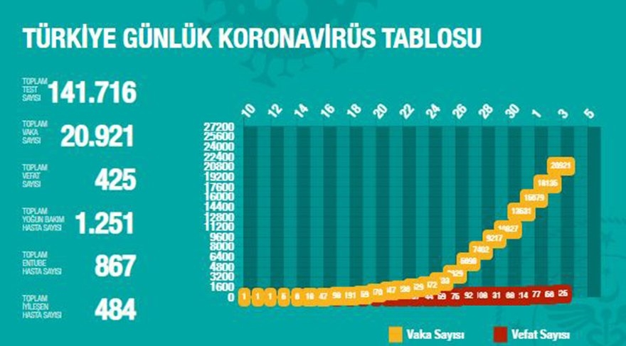 Son 24 saatteki verileri kamuoyu ile paylaşan Bakan Koca, “16 bin 160 test yapıldı. Toplamda 140 bin 716 test yapılmış oldu. 2 bin 786 pozitif vaka daha tespit ettik. Toplam vaka sayımız 20 bin 921 oldu. Bugün kaybettiğimiz 69 kişi ile toplam can kaybımız 425’i buldu. Şu an tedavisi devam eden hastalarımızdan bin 251’i yoğun bakımdadır. Bunların 867’si solunum cihazına bağlı durumdadır. 484 hastamız ise iyileşerek taburcu edilmiştir” dedi.