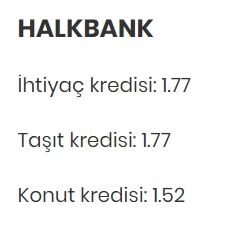 HALKBANKİhtiyaç kredisi: 1.77Taşıt kredisi: 1.77Konut kredisi: 1.52