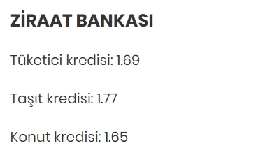 ZİRAAT BANKASITüketici kredisi: 1.69Taşıt kredisi: 1.77Konut kredisi: 1.65