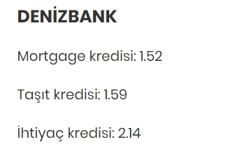 DENİZBANKMortgage kredisi: 1.52Taşıt kredisi: 1.59İhtiyaç kredisi: 2.14