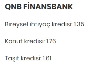 QNB FİNANSBANKBireysel ihtiyaç kredisi: 1.35Konut kredisi: 1.76Taşıt kredisi: 1.61