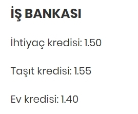 İŞ BANKASIİhtiyaç kredisi: 1.50Taşıt kredisi: 1.55Ev kredisi: 1.40