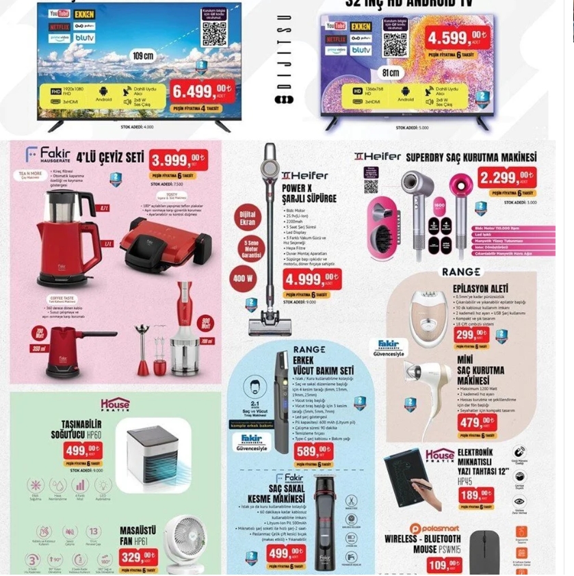 Teknoloji ve Elektrikli Ev Aletleri: Dijitsu 43″ 4K Smart Android TV: 6,499 TL Dijitsu 32″ HD Android TV: 4,599 TL Fakir 4'lü Çeyiz Seti: 3,999 TL Fakir Saç Sakal Kesme Makinesi: 499 TL Fakir 15'i 1 Arada Erkek Bakım Seti: 999 TL Heifer Power X Şarjlı Süpürge: 4,999 TL Heifer Süperdry Saç Kurutma Makinesi: 2,299 TL Listenin devamını görmek için Lütfen sonraki sayfaya geçiniz..