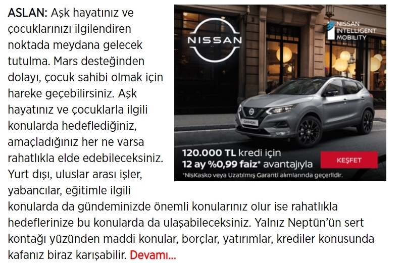 ASLAN: Aşk hayatınız ve çocuklarınızı ilgilendiren noktada meydana gelecek tutulma. Mars desteğinden dolayı, çocuk sahibi olmak için hareke geçebilirsiniz. Aşk hayatınız ve çocuklarla ilgili konularda hedeflediğiniz, amaçladığınız her ne varsa rahatlıkla elde edebileceksiniz. Yurt dışı, uluslar arası işler, yabancılar, eğitimle ilgili konularda da gündeminizde önemli konularınız olur ise rahatlıkla hedeflerinize bu konularda da ulaşabileceksiniz. Yalnız Neptün'ün sert kontağı yüzünden maddi konular, borçlar, yatırımlar, krediler konusunda kafanız biraz karışabilir.