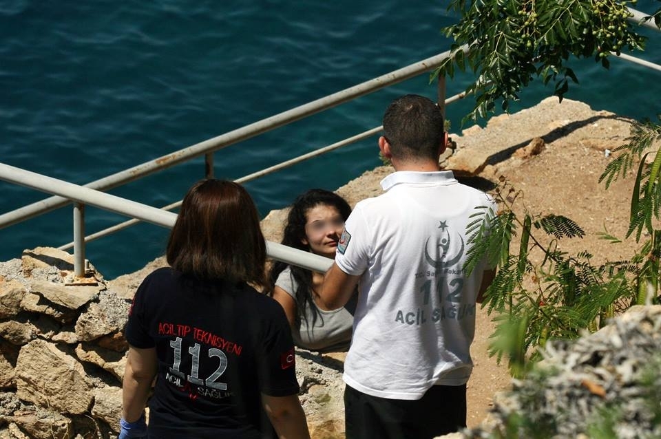 S.Y.’nin dalgınlığından faydalanmak isteyen sağlık görevlisi elini uzattığı anda paniğe kapılan genç kız çığlık atarak falezlerden düştü. Sırt üstü suya düşen S.Y.’yi kurtarmak içinde deniz polise hemen suya atladı. Çığlık atmaya devam eden S.Y. bota alınarak Kaleiçi Yat Limanı’na çıkarıldı. İlk müdahalesi ambulansta yapılan S.Y. Antalya Eğitim ve Araştırma Hastanesi’ne kaldırıldı. Genç kızın sağlık durumunun iyi olduğu öğrenildi.