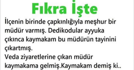 – Kaymakam bey gözüme bi kadını kestirdim mi yavaşca yaklaşıp sağ elimi sağ kalçasina atiyorum, baktim ses yok sol elimi de sol kalçaya atıp devam ediyorum…. Eve giden kaymakam kapıdan girince karısını bulaşık yıkarken görür ve der ki dur bakalım müdürden öğrendiğimi uygulayayım…Sağ elini bi atar karısının kalçasına, sonra sol elini… bu esnada karısı;– Ay müdür bey sizin tayininiz çıkmamış mıydı?