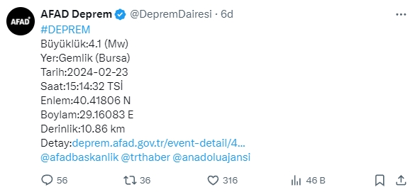 Bursa Valisi Mahmut Demirtaş, AA muhabirine, depremin ardından ekipleri sahada tarama faaliyetleri için görevlendirdiklerini söyledi. Vali Demirtaş, "Şu ana kadar bize gelen herhangi bir olumsuzluk yok. Ekiplerimizin sahadaki tarama çalışmaları sürüyor." dedi.