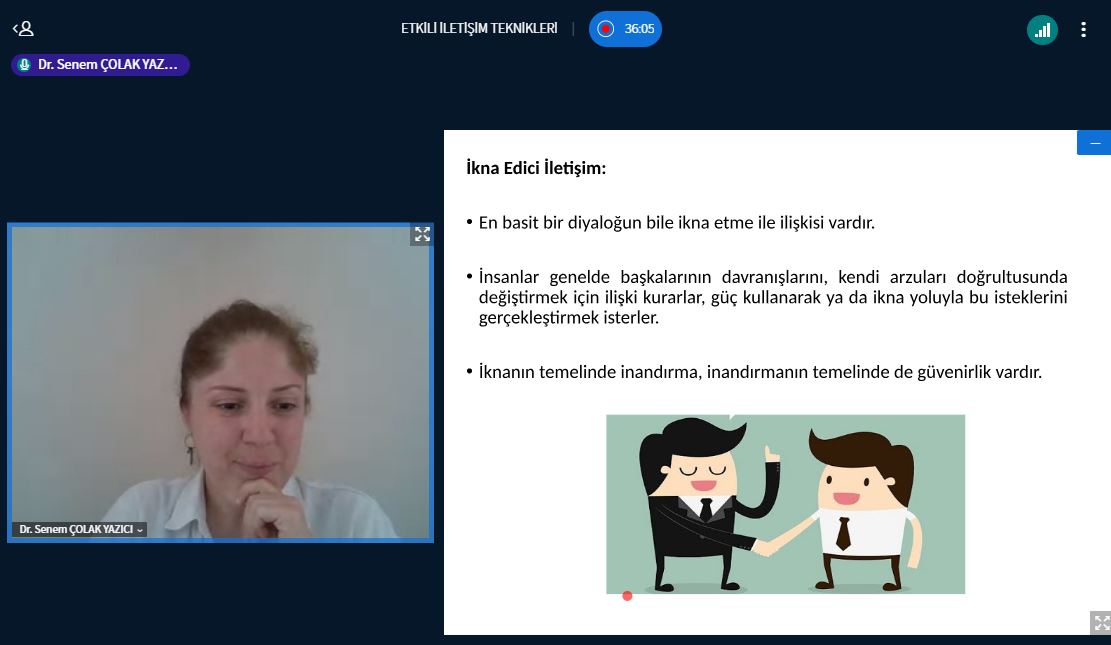 Düzce Üniversitesi Kariyer Geliştirme ve Mezun İzleme Uygulama Araştırma Merkezi ile Eğitim Fakültesi iş birliğinde düzenlenen “Kariyerimi Planlıyorum” eğitim serisinin üçüncüsü olan “Etkili İletişim Teknikleri” başlıklı program, çevirim içi olarak gerçekleştirildi. Programda, Dr. Öğretim Üyesi Senem Çolak Yazıcı, insanların günlük hayatlarının büyük bir çoğunluğunu çevreleri ile iletişim kurarak geçirdiğini, ancak gerçekleşen iletişimin bir kısmının karşı tarafta etkili olmadığını dile getirerek, katılımcılara etkili iletişim kurmak için gerekli olan unsurlar hakkında detaylı bilgiler aktardı.