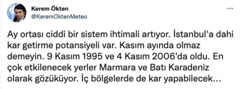 Ökten'in paylaşımı şu şekilde; "Ay ortası ciddi bir sistem ihtimali artıyor. İstanbul'a dahi kar getirme potansiyeli var. Kasım ayında olmaz demeyin. 9 Kasım 1995 ve 4 Kasım 2006'da oldu. En çok etkilenecek yerler Marmara ve Batı Karadeniz olarak gözüküyor. İç bölgelerde de kar yapabilecek."