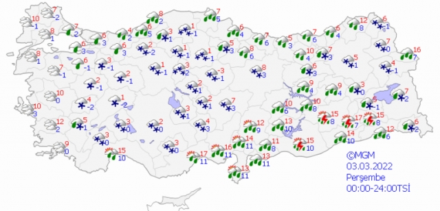 Çok bulutlu, kıyı kesimlerinin yağmurlu, iç kesimlerinin karla karışık yağmur ve kar yağışlı geçeceği tahmin ediliyor.