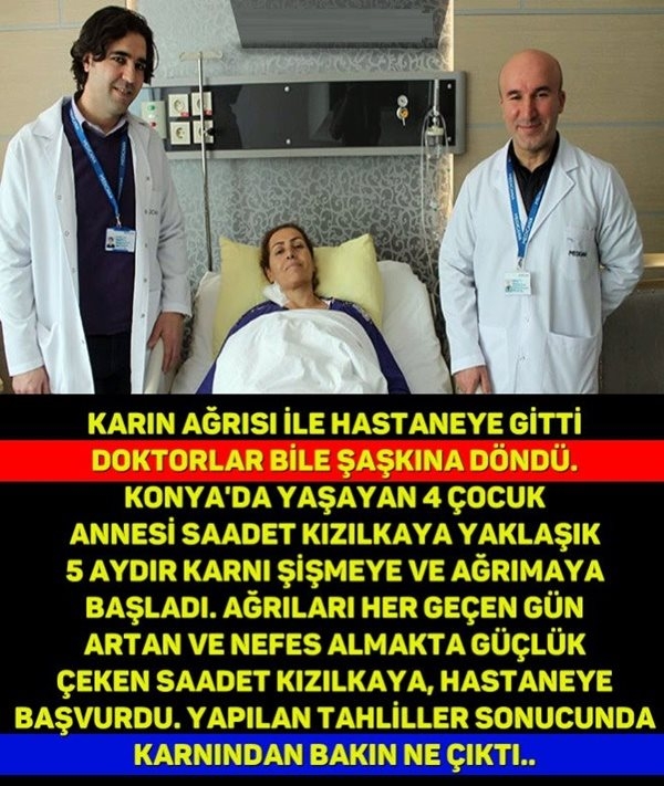 KARIN AĞRISI DİYE HASTANEYE GİTTİ AMA BAKIN KARNINDA NE ÇIKTI. DETAYLAR Karın Ağrısıyla Hastaneye Gitti.. KARIN AĞRISI DİYE HASTANEYE GİTTİ AMA BAKIN KARNINDA NE ÇIKTI..Konya'da yaşayan 4 çocuk annesi Saadet Kızılkaya, yaklaşık 5 aydır karnı şişmeye ve ağrımaya başladı Ağrıları her geçen gün artan ve nefes almakta güçlük çeken Saa det Kızılkaya, hastaneye başvurdu