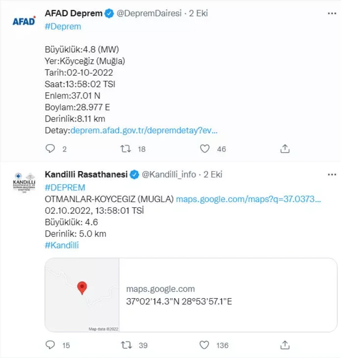 Kandilli Rasathanesi'nin Twitter hesabında, Muğla'nın Köyceğiz ilçesinde saat 13:58’de 4.6 büyüklüğünde depremin meydana geldiği açıklandı. AFAD'DAN İLK AÇIKLAMA