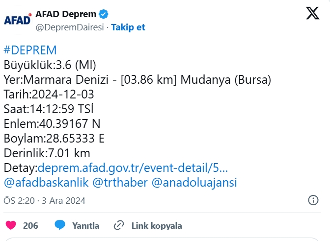 Deprem bölgesi olan ülkemizde 6 Şubat'ın ardından artan depremler bitmek bilmiyor. Son sallanan il ise Bursa oldu. Birçok kullanıcı depremi hisseder hissetmez sosyal medya hesabından yaşadıkları korkuyu aktardı.Afet ve Acil Durum Yönetimi Başkanlığı'ndan yapılan açıklamada depremin merkez üssü Marmara Denizi, en yakın ilçe Mudanya, büyüklüğü 3,6 derinliği ise 7.01 km olarak açıklandı. Haberin devamını okumak için Lütfen sonraki sayfaya geçiniz..