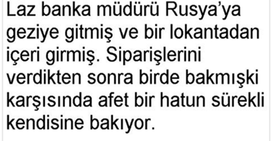 Laz Banka Müdürü Laz banka muduru Rusya'ya geziye gitmis ve bir lokantadan iceri girmis. Siparislerini verdikten sonra birde bakmiski karsisinda afet bir hatun surekli kendisine bakiyor. Davetkar bakislarla hatunu masaya cagirmis, hatun gelip masaya oturmus.