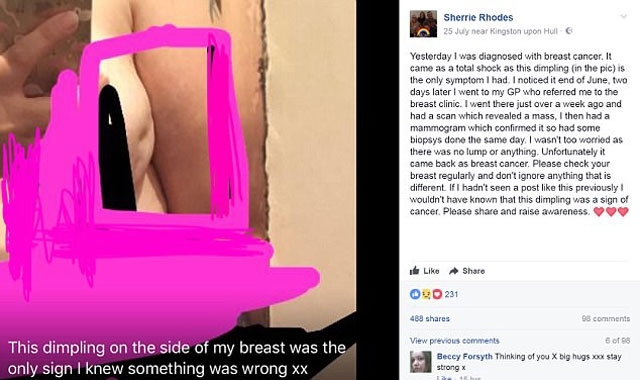 Başka bir semptoma rastlamayan kadın gamzelerin kanser belirtisi olduğunu bilmiyordu. Hastaneden eve dönerken aklına diğer kadınların da bunu bilmeme ihtimali geldi ve bunun üzerine göğsünün fotoğrafını çekip sosyal medyada paylaşmaya karar verdi.