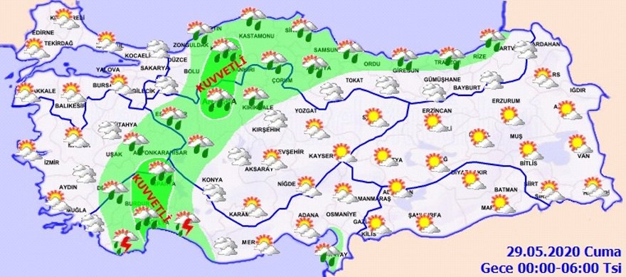 MGM’den yapılan açıklamada şu ifadelere yer verildi; Ülkemiz genelinin parçalı ve çok bulutlu, Marmara, Ege, Akdeniz, İç Anadolu, Karadeniz ile Erzincan, Ardahan, Kars ve Iğdır çevreleri ile bu akşam ilk saatlerde Kırklareli, Tekirdağ, Balıkesir ve Manisa çevreleri ile Çanakkale’nin güneydoğu ilçelerinin sağanak ve gök gürültülü sağanak yağışlı geçeceği tahmin ediliyor.