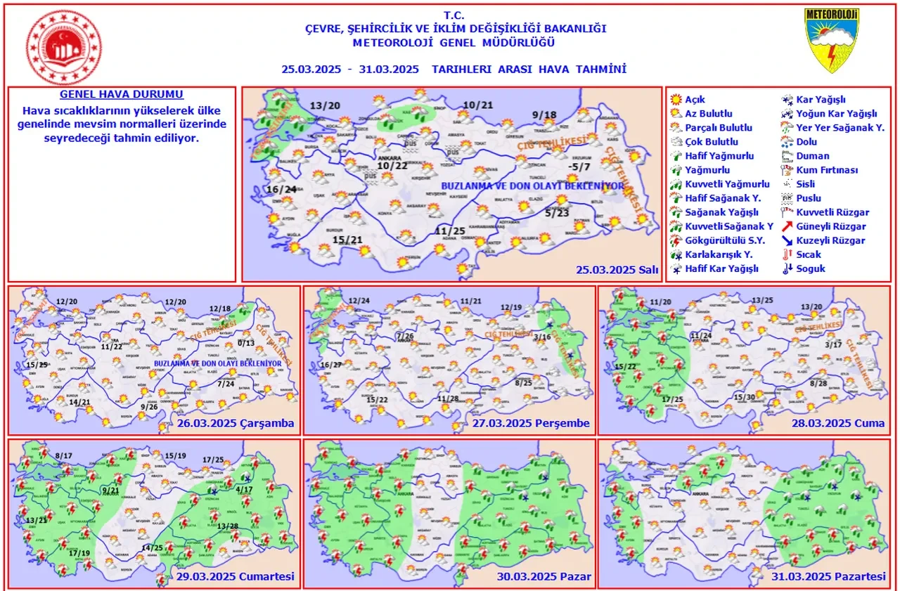 MARMARA BÖLGESİ HAVA DURUMU EDİRNE 13°C, 23°C Sabah saatlerinde yerel sağanak yağışlı İSTANBUL 12°C, 19°C Parçalı ve çok bulutlu, hafif sağanak yağışlı KIRKLARELİ 11°C, 18°C Sabah saatlerinde yerel sağanak yağışlı KOCAELİ 14°C, 23°C Parçalı ve çok bulutlu EGE BÖLGESİ HAVA DURUMU AFYON 9°C, 22°C Parçalı ve çok bulutlu DENİZLİ 14°C, 27°C Parçalı ve çok bulutlu İZMİR 16°C, 24°C Parçalı ve çok bulutlu MANİSA 14°C, 25°C Parçalı ve çok bulutlu AKDENİZ BÖLGESİ HAVA DURUMU ADANA 10°C, 24°C Parçalı ve az bulutlu ANTALYA 15°C, 20°C Parçalı ve az bulutlu HATAY 11°C, 24°C Parçalı ve az bulutlu MERSİN 14°C, 22°C Parçalı ve az bulutlu İÇ ANADOLU BÖLGESİ HAVA DURUMU ANKARA 10°C, 22°C Parçalı ve çok bulutlu ESKİŞEHİR 10°C, 23°C Parçalı ve çok bulutlu KONYA 10°C, 24°C Parçalı ve çok bulutlu NEVŞEHİR 9°C, 20°C Parçalı ve çok bulutlu BATI KARADENİZ BÖLGESİ HAVA DURUMU BOLU 8°C, 21°C Parçalı ve çok bulutlu KARABÜK 9°C, 24°C Öğle saatlerinden sonra sağanak yağışlı SİNOP 9°C, 18°C Öğle saatlerinden sonra sağanak yağışlı ZONGULDAK 13°C, 22°C Öğle saatlerinden sonra hafif sağanak yağışlı ORTA ve DOĞU KARADENİZ BÖLGESİ HAVA DURUMU AMASYA 10°C, 25°C Parçalı, yer yer çok bulutlu ARTVİN 3°C, 17°C Parçalı, yer yer çok bulutlu SAMSUN 9°C, 19°C Parçalı, yer yer çok bulutlu TRABZON 8°C, 16°C Parçalı, yer yer çok bulutlu DOĞU ANADOLU BÖLGESİ HAVA DURUMU ERZURUM -6°C, 9°C Parçalı, zamanla çok bulutlu KARS -7°C, 10°C Parçalı, zamanla çok bulutlu MALATYA 4°C, 21°C Parçalı ve az bulutlu VAN -1°C, 10°C Parçalı ve az bulutlu GÜNEYDOĞU ANADOLU BÖLGESİ HAVA DURUMU DİYARBAKIR 5°C, 23°C Az bulutlu ve açık GAZİANTEP 8°C, 23°C Parçalı ve az bulutlu SİİRT 5°C, 21°C Az bulutlu ve açık ŞANLIURFA 11°C, 25°C Parçalı ve az bulutlu Haberin devamını okumak için Lütfen sonraki sayfaya geçiniz..