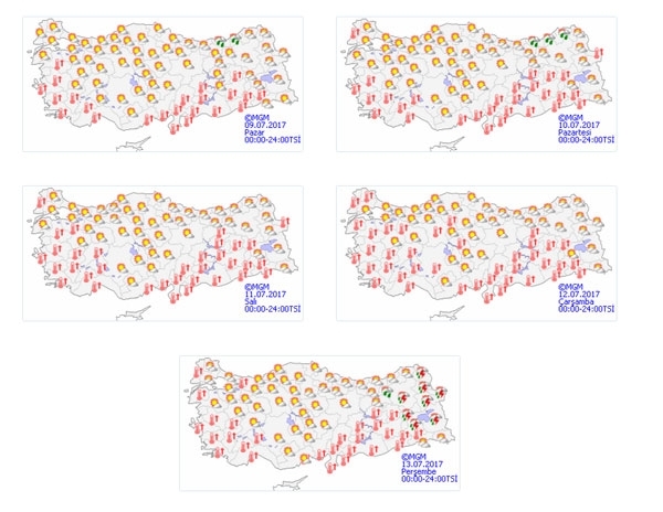 Meteoroloji'nin tahmin raporunda, hava sıcaklıklarının; Ankara'da 32-36, İstanbul'da 30-33, İzmir'de 36-39, Aydın'da 41-43, Antalya'da 39-42, Adana'da 38-40, Zonguldak ve Samsun'da 26-28, Trabzon'da 24-27, Erzurum'da 29-31, Diyarbakır'da 40-42 dereceler civarında seyredeceğinin tahmin edildiği ifade edildi.