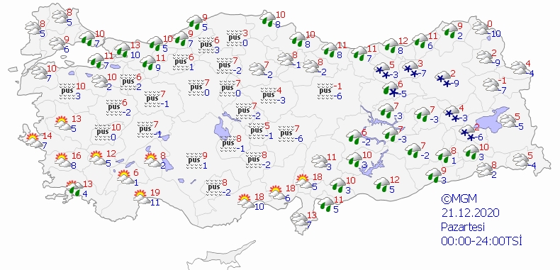 21 Aralık 2020 Pazartesi Türkiye geneli hava durumu tahmin haritası