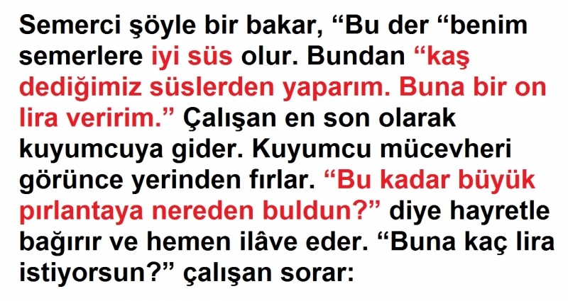 Çalışan en son olarak kuyumcuya gider. Kuyumcu mücevheri görünce yerinden fırlar. “Bu kadar büyük pırlantaya nereden buldun?” diye hayretle bağırır ve hemen ilâve eder. “Buna kaç lira istiyorsun?” çalışan sorar:
