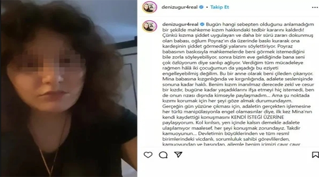 Verdiğim tüm mücadeleye rağmen hâlâ iki çocuğumun da yaşadığı bu eziyeti engelleyebilmiş değilim. Bu bir anne olarak beni çileden çıkarıyor. Mina babasına kızgınlığında ve kırgınlığında, adalete seslenişinde sonuna kadar haklı. Benim kızım inanılmaz derecede zekî ve cesur bir kızdır, bugüne kadar yaşadıklarını ifşa etmeyi hiç istemedi, ben de onun rızası dışında kimseyle paylaşmadım… Ama şu noktada kızımı korumak için her şeyi göze almak durumundayım. Gerçeğin gün yüzüne çıkması için, adaletin gerçekten işlemesine her türlü manipülasyonla engel olamasınlar diye, ilk kez Mina’nın kendi kaydettiği konuşmasını KENDİ İSTEĞİ ÜZERİNE paylaşıyorum. Kol kırılsın, yen içinde kalsın demekle adalete ulaşılamıyor maalesef, her şeyi konuşmak zorundayız. Takdir kamuoyunun… Devletimin büyüklerinden ve tüm resmî birimlerindeki vicdanlı, sorumluluk sahibi görevlilerden, kamuoyundan ve basından, ailemle benim içimizi cayır cayır yakan bu konuyla alakalı destek ve hakkaniyet bekliyorum… ACİL!” Lütfen sonraki sayfaya geçiniz..