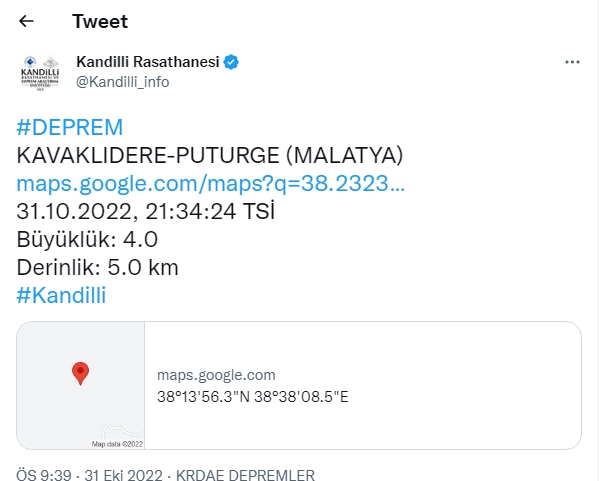 Malatya’da deprem meydana geldi . Depremin şiddeti merkez üssü ve saatiyle ilgili bilgileri ise şu şekilde: saat 21:34 te 5.0 km derinliğinde meydana geldi. Büyüklüğü ise 4.0 olarak açıklandı.