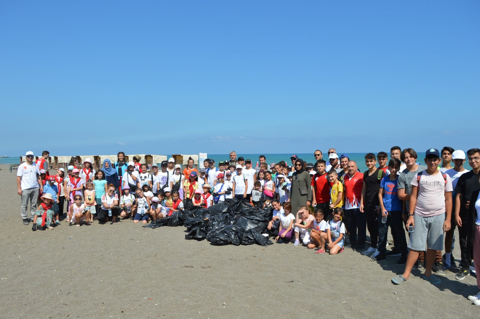 Düzce’nin Akçakoca ilçesinde yaz spor okulu ve Kuran kursuna giden öğrenciler temiz bir çevre için sahile girdiler, 1,5 ton plastik, metal ve cam atık topladılar.