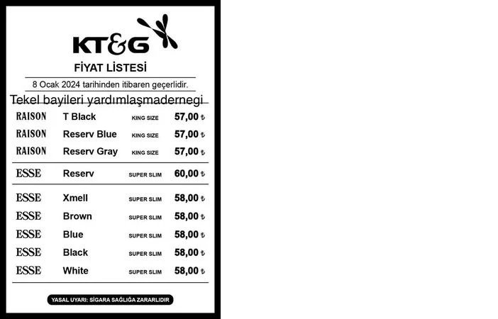 Son olarak da KT&G sigara grubunda fiyat artışı yaşandı. Tekel Bayileri Yardımlaşma Derneği (TBYD) Başkanı Erol Dündar, gelen zamları sosyal medya hesabından duyurdu. TÜM SİGARA GRUPLARI ZAMLANDI 2024 yılında sigara tiryakilerine bir kötü haber verildi. Zamlı sigara gruplarına bir de KT&G grubu eklendi.