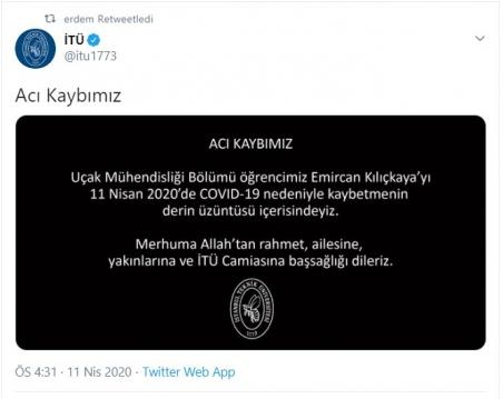 İstanbul Teknik Üniversitesi (İTÜ) Uçak ve Uzay Bilimleri son sınıf öğrencisi Emircan Kılıçkaya, bu sabah koron.avirüs nedeniyle hayatını kaybetti. İTÜ’den yapılan açıklamada "Uçak Mühendisliği Bölümü öğrencimiz Emircan Kılıçkaya'yı 11 Nisan 2020'de COVID-19 nedeniyle kaybetmenin derin üzüntüsü içerisindeyiz. Merhuma Allah'tan rahmet, ailesine, yakınlarına ve İTÜ Camiasına başsağlığı dileriz" denildi.