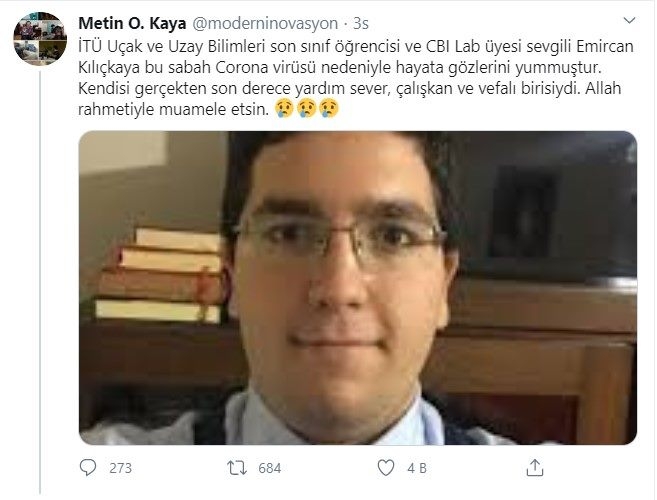 Kılıçkaya'nın mezun olduğu Fahreddin Kerim Gökay Anadolu Lisesi ise sosyal medyadan "2015 dönem birincisi mezunumuz ve İTÜ Uçak ve Uzay Bilimleri son sınıf öğrencisi Emircan Kılıçkaya bu sabah Corona virüsü nedeniyle hayata gözlerini yummuştur. Allah’tan rahmet, kederli ailesine ve yakınlarına başsağlığı dileriz. Başımız sağolsun" mesajını yayımladı.