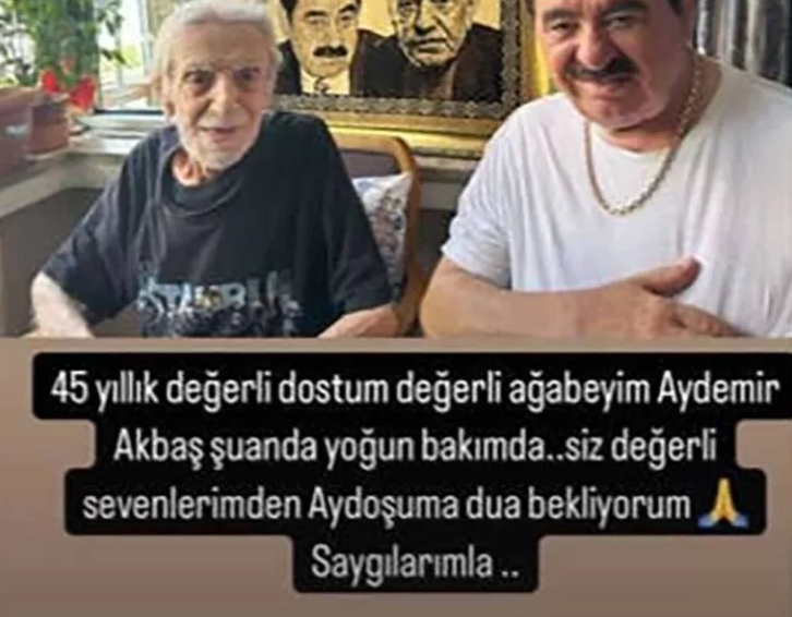Oyuncu Aydemir Akbaş, hastaneye kaldırıldı. Evinde baygın bulunan Akbaş'ı yakınlarının hastaneye götürdüğü belirtildi. İbrahim Tatlıses, sosyal medya hesabından yoğun bakımda tedavisi süren Akbaş ile ilgili bir açıklama yaptı. Tatlıses, "45 yıllık değerli dostum, değerli ağabeyim Aydemir Akbaş, şu anda yoğun bakımda. Siz değerli sevenlerimden dua bekliyorum. Saygılarımla" ifadelerini kullandı.Yeşilçam'ın efsane isimlerinden olan ve uzun süredir kanserle mücadele eden Aydemir Akbaş, evinde baygın bulunduktan sonra hastaneye kaldırıldı. 88 yaşındaki oyuncudan gelen kötü haberi İbrahim Tatlıses sosyal medya üzerinden duyurdu. Tatlıses, Akbaş'ın sevenlerinden dua beklediğini söyledi. Oyuncu Aydemir Akbaş, hastaneye kaldırıldı. Evinde baygın bulunan ünlü oyuncunun yoğun bakımda olduğu öğrenildi. Bir çok dizi, film ve tiyatro oyununda yer alan 88 yaşındaki usta oyuncu Aydemir Akbaş, daha önce gırtlak kanserine yakalanmış ve bu hastalığı yenmeyi başarmıştı. Ancak usta oyuncu geçtiğimiz yılın ocak ayında sosyal medya hesabından yaptığı paylaşım ile yeniden kansere yakalandığını duyurmuştu. HABERİ İBRAHİM TATLISES DUYURDU İbrahim Tatlıses, bir süredir kanserle mücadele eden yakın dostu Aydemir Akbaş'ın yoğun bakıma kaldırıldığını duyurdu. Akbaş ile fotoğrafını paylaşan Tatlıses, "45 yıllık değerli dostum, değerli ağabeyim Aydemir Akbaş şu anda yoğun bakımda… Siz değerli sevenlerimden Aydoşuma dua bekliyorum. Saygılarımla…" dedi. 2. Sayfa'da yer alan habere göre usta sanatçıdan üzen haber geldi. Aydemir Akbaş'ın entübe edildiği iddia edildi.