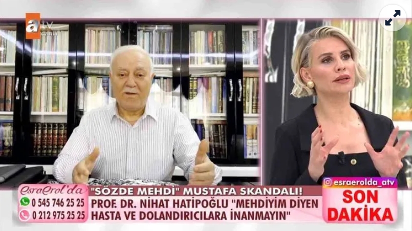 ORTAYA ÇIKTI 'Mehdi' olduğunu iddia eden Mustafa Çabuk, kaçak kazıda yakalandı… Sözde hocanın şu an akli dengesinin yerinde olmadığı gerekçesi ile yakalandığı anda Bakırköy Ruh ve Sinir Hastalıkları Hastanesi'ne yatırılmak üzere aranması olduğu ortaya çıktı. Sözde hoca hakkında gelen "bıçaklama, kasten yaralama, sahtecilik" gibi pek çok korkutan ihbar herkesi şoke etti. ."MEHDİ SÖZ KONUSU DEĞİLDİR" Nihat Hatipoğlu'nun açıklamaları şöyle: "Mehdinin bulunduğu dönemde deccal olacaktır. Şu anda söz konusu değildir. Bu saydıklarımdan hiçbiri şuanda yok. Mehdi de yok. .Tarih boyunca ben mehdiyim mehdilik bana verildi diyen yığınca insan çıktı. Birçok insanın ölümüne sebep oldu. Mehdi'nin işaretleri vardır, hiçbirisi yer yüzünde mümkün değil. Akıl yönünden ruh yönünden hasta olan bazı insanlar kendilerini mehdi zannedebiliyorlar Bir kısmı hasta olduğu için yapıyor bir kısmı da rant sağlamak için yapıyor. Şuan da mehdi söz konusu değildir. Tarih boyunca yüzbinlerce insan çıktı ve çoğunun akıl yönünden problemi var." .kaynak:ahaber.com.tr