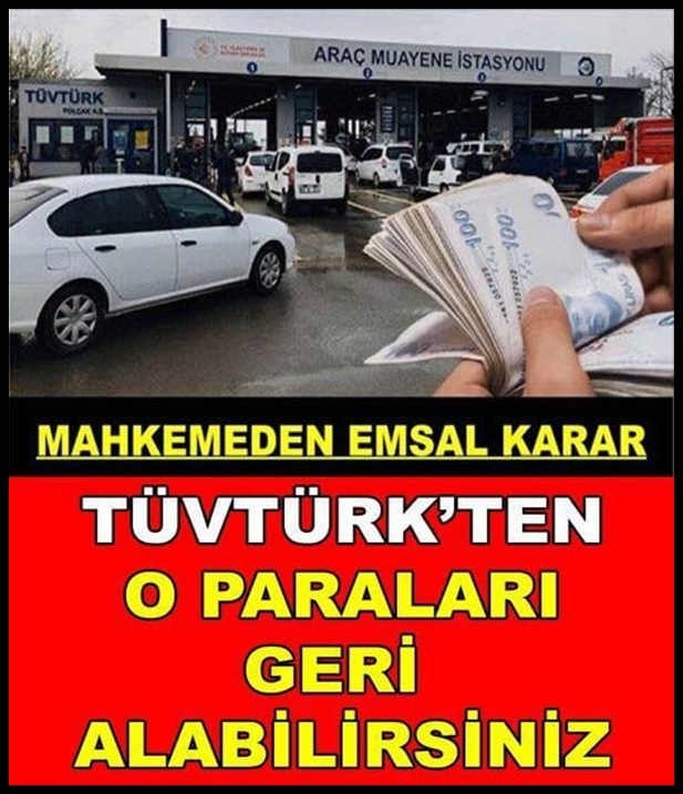 Mahkemeden Emsal Karar TÜVTÜRK’ten O Paranızı Geri Alabilirsiniz.. Mahkeme TÜVTÜRK Araç Muayene İstasyonu’nda ilgili emsal sayılabilecek bir karar verdi… Haberimizin devamını okumak için Lütfen sonraki sayfaya geçiniz..