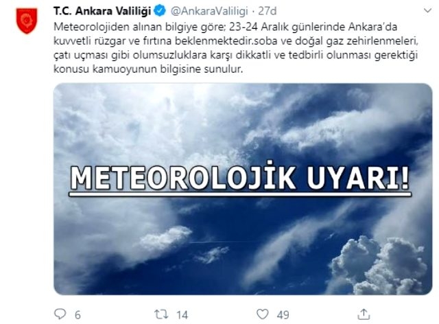 Ankara Valiliği’nin resmi Twitter hesabından yapılan paylaşımda, “Meteorolojiden alınan bilgiye göre; 23-24 Aralık günlerinde Ankara’da kuvvetli rüzgar ve fı-rtına beklenmektedir. Soba ve doğal gaz z-ehirlenmeleri, çatı uçması gibi o-lumsuzluklara karşı dikkatli ve t-edbirli olunması gerektiği konusu kamuoyunun bilgisine sunulur.” ifadelerine yer verildi.