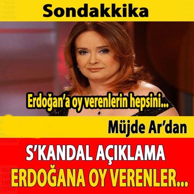 29 Mayıs 2023 Pazartesi 23:23Yeşilçam filmlerinde hep en ahlaksız filmlerde oynayan Müjde Ar dün gece Başkan Erdoğan'ın seçimi kazanmasını hazmedemedi ve Cumhur ittifakında Başkan Erdoğana oy veren herkes hakkında skandal twitler attı
