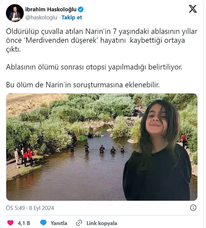 08 Eylül 2024 Pazar 20:09Narin’in ölümü, şüpheli bir şekilde gerçekleşti ve Narin'in ablasının ölümü de 'şüpheli' olarak gündemde. Gazeteci İbrahim Haskaloğlu, Narin'in ablasının ölümüyle ilgili şunları söyledi;"Öldürülüp çuvalla atılan Narin’in 7 yaşındaki ablasının yıllar önce ‘Merdivenden düşerek’ hayatını kaybettiği ortaya çıktı. Ablasının ölümü sonrası otopsi yapılmadığı belirtiliyor. Bu ölüm de Narin’in soruşturmasına eklenebilir." Haberimizin devamını okumak için Lütfen sonraki sayfaya geçiniz..