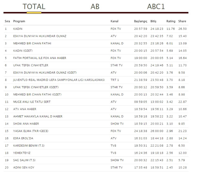salı akşamının reyting galibi FOX TV ekranlarında yayınlanan Kadın dizisi oldu. İKİNCİ SIRADA EŞKIYA VAR İkinci sırada ATV ekranlarının iddialı dizisi Eşkıya Dünyaya Hükümdar Olmaz'ın yer aldığı sıralamada, üçüncülük koltuğuna Mehmed Bir Cihan Fatihi oturdu. MİLYONLUK YAPIM OLDUĞU YERDE SAYIYOR ilk bölümüyle reyting sıralamasında üçüncü sırada yer alan milyonluk yapım Mehmed Bir Cihan Fatihi, beklenen patlamayı yine yapamadı. İşte dün gecenin reyting sıralaması;