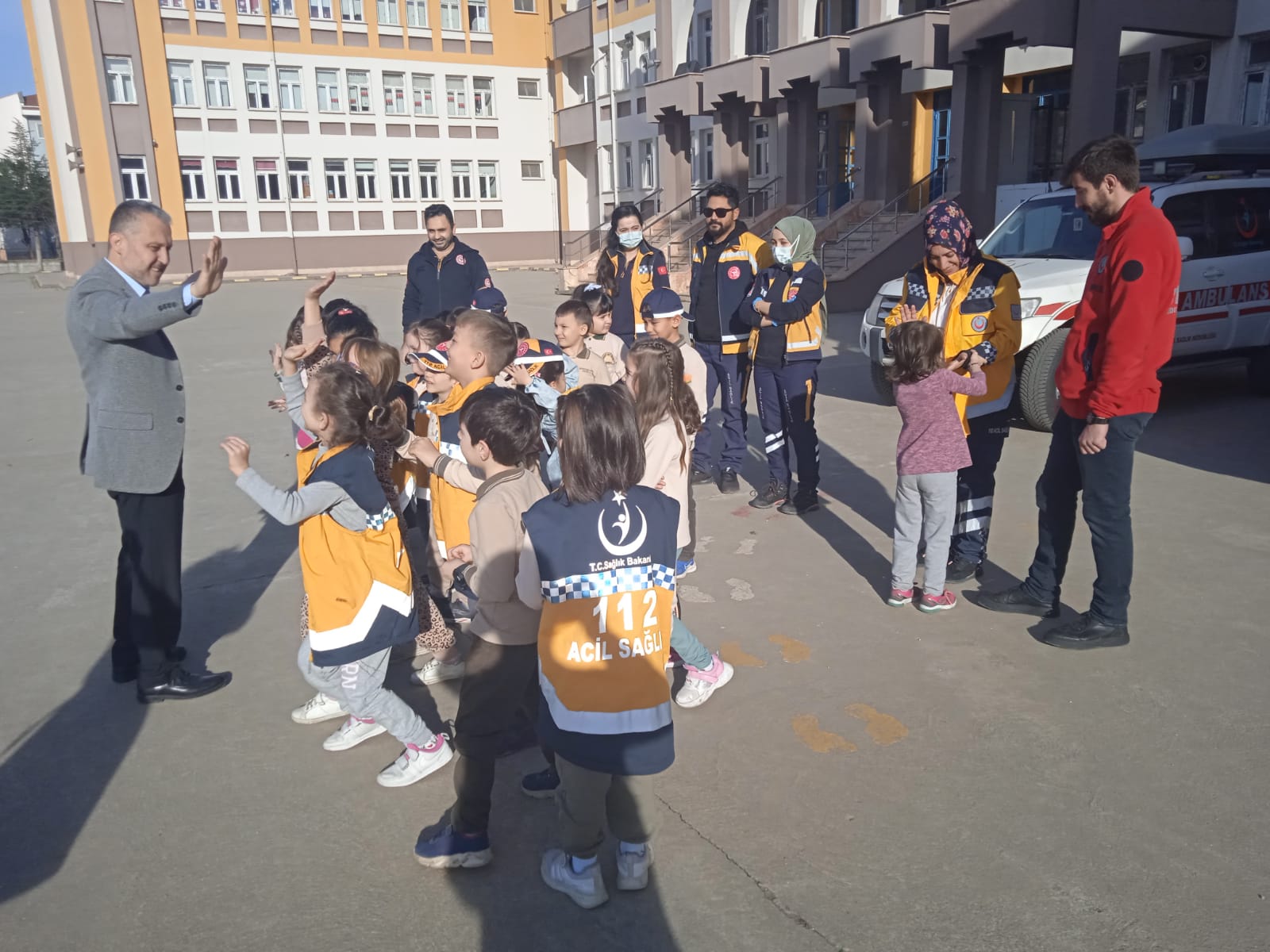 Sağlık Müdürlüğü Ambulans Servisi Başhekimliği ekiplerince; Minik 112 Projesi dahilinde, Mehmet Akif Ersoy Anaokulu ve İlkokulu’nda öğrencilere acil sağlık hizmetleri ve ambulans tanıtıldı.