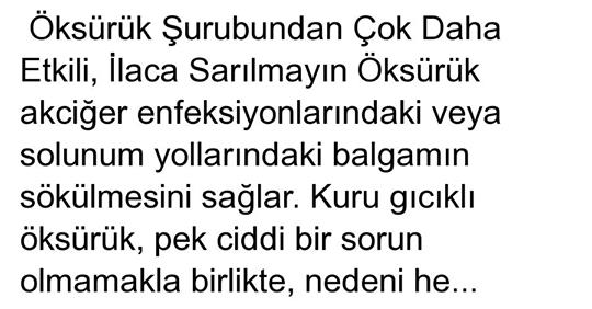 Öksürük Şurubundan Çok Daha Etkili, İlaca Sarılmayın Öksürük akciğer enfeksiyonlarındaki veya solunum yollarındaki balgamın sökülmesini sağlar. Kuru gıcıklı öksürük, pek ciddi bir sorun olmamakla birlikte, nedeni her zaman bilinemez. Soğuk algınlığı sırasında burun akıntısının geriye giderek solunum borusunu tahriş etmesinden dolayı olabilir.