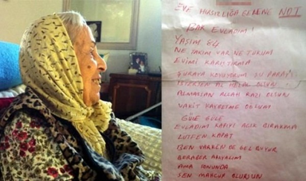 “Eve hırsızlığa gelene not. Bak evladım yaşım 84. Ne takım var, ne tutkum. Evimi karıştırma. Şuraya koyuyorum şu parayı. İstersen al, helal olsun. Almazsan Allah razı olsun. Vakit kaybetme oğlum. Güle güle. Evladım kapıyı açık bırakma lütfen kapat. Ben varken de gel buyur. Beraber arayalım, ama sonunda sen mahcup olursun.”