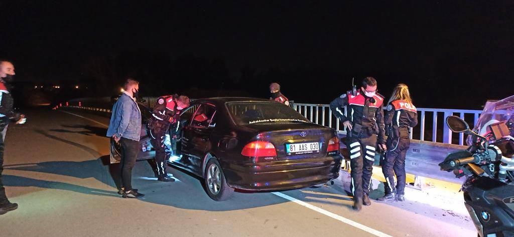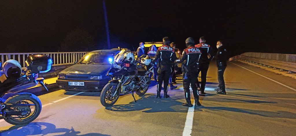 Gece saatlerinde Düzce merkeze bağlı Darıca Mahallesi’nde bulunan otoyol üst geçidinde araçlarını park eden şahıslar sohbet etmeye başladı. Çevrede bulunan vatandaşların ihbarı üzerine Asayiş Şube Müdürlüğü’ne bağlı Motorlu Asayiş Timleri (Yunus Ekipleri) ve Trafik Tescil Denetleme Şube Müdürlüğü Ekipleri, köprü üzerinde sohbet eden şahıslar üzerinde uygulama yaptı.