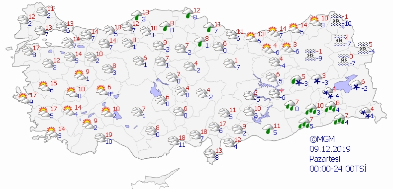 07 Aralık 2019 Cumartesi 19:13Yağışların; Şanlıurfa'da yer yer kuvvetli olmak üzere Güneydoğu Anadolu ile Ordu'da yağmur, yağış alan diğer yerlerde karla karışık yağmur ve kar şeklinde olması bekleniyor. Rüzgarın, sabah saatlerinde Akdeniz'in iç kesimlerinde kuzey yönlerden kuvvetli (40-60 km/sa) olarak eseceği tahmin ediliyor. Sabah ve gece saatlerinde iç kesimlerde buzlanma ve don ile birlikte yer yer pus ve sis bekleniyor.