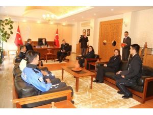İl Emniyet Müdürü İbrahim Kulular ile beraberindeki Polis Okulu Müdür Yardımcısı İbrahim İzgül, Emniyet Amiri İrfan Sancar ve teşkilattaki birimleri temsilen gelen polis memurları, Polis Haftası Kutlamaları kapsamında Vali Düzgün’ü ziyaret ederek, çiçek takdim etti.
