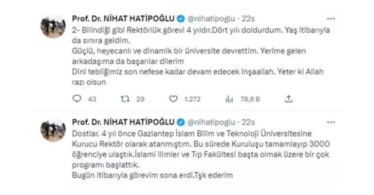 İlahiyatçı Nihat Hatipoğlu, sosyal medya hesabı üzerinden bir veda mesajı yayımladı. “Yaş itibarıyla da sınıra geldim” diyen Hatipoğlu, kurucu rektör olarak görev aldığı Gaziantep İslam Bilim ve Teknoloji Üniversitesi’nden ayrıldığını duyurdu. Hatipoğlu, açıklamasının devamında “Dini tebliğimiz son nefese kadar devam edecek inşallah” ifadelerini kullandı. “Dört yılı doldurdum. Yaş itibarıyla da sınıra geldim.” diyen Hatipoğlu; güçlü, heyecanlı ve dinamik bir üniversite devrettiğini belirterek yerine atanan isme başarılar diledi. Hatipoğlu açıklamasının devamında ise “Dini tebliğimiz son nefese kadar devam edecek inşallah. Yeter ki Allah razı olsun” ifadelerini kullandı. Hatipoğlu’nun sosyal medya hesabı üzerinden yaptığı açıklama şöyle;